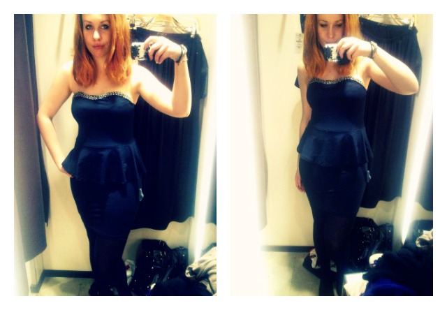 I just fell in love with this dress, it’s perfect! I bought it at Zara, and it’s a dark navy blue with peplum and a gorgeous crystal-glittery neckline! Feel kinda badass in this with heels, harharhar.