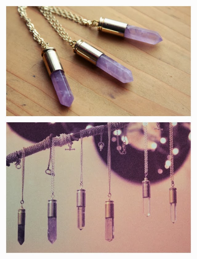 I dn’t know about you, but I am just a liiiiitle bit superstitious (really, just a little bit) and I love the thought of a crystal dangling from my neck protecting me. I have seen quite a lot of these necklaces in stores but they are mostly made out of glass or plastic – I personally prefer the real deal made out of Rose Quartz or other crystals. The one I own looks a bit like in the right picture only that my crystal is purple. I would really love for a clear companion to join me!