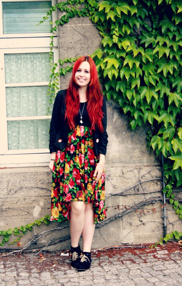 I love how these pictures turned out, YOU ARE GREAT MOM! She also chose the background and it looks really nice together with the dress, I’m so proud of my Mommy :’D The dress is one of my favorite dresses of all time; I bought it in some random store in Japan I can’t remember and they had only shit but THIS dress. In general I am not a huge fan of floral patterns and flowers but I loved this bright colored dress so much. You probably already saw it on my birthday :3 The blazer I am wearing is my goes-with-everything-blazer of all time. If I’m wearing a blazer, 80% it’s this one. I got it on sale at H&M years ago for 10$ and it’s still in best shape. I decorated it with some buttons a friend got me in London (first picture). I know it’s nothing special to show off but it’s something I wear often. I try to make the next outfit post a bit more exciting :> Oh and btw if you should be confused; this will be the last post with my old hair! 😀