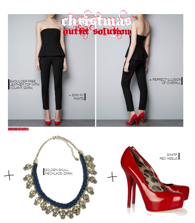 So just imagine the top piece being the leather top and there you go! I personally think it will even look better with the leather top because of the fabric mix (I JUST LOVE LEATHER.) and now that I look at it the overall’s top piece looks a bit too simple for my liking. I bought the necklace with the golden skulls because it is so unique! Tried it on and it goes really well with the shoulder free top. Plus, I really like the idea of stepping out of the usual glitter-dress-for-christmas comfort zone (: The heels are quite self-explanatory I guess; I LOVE red shoes with a only-black outfit. Makes it so much more exciting!