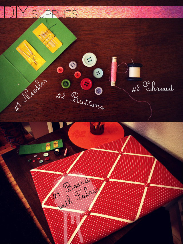 You’ll need various needles, buttons as many and in whatever design you prefer and thread that’ll match your buttons. I originally intended to make the pinboard with fabric myself, but I found a really cute and cheap one at my local crafting store so I bought the already premade one to save myself time and nerves! If you want/need to make a pinboard yourself you’ll additionally need fabric, a corkboard, ribbon, a staple gun and upholstery tacks.