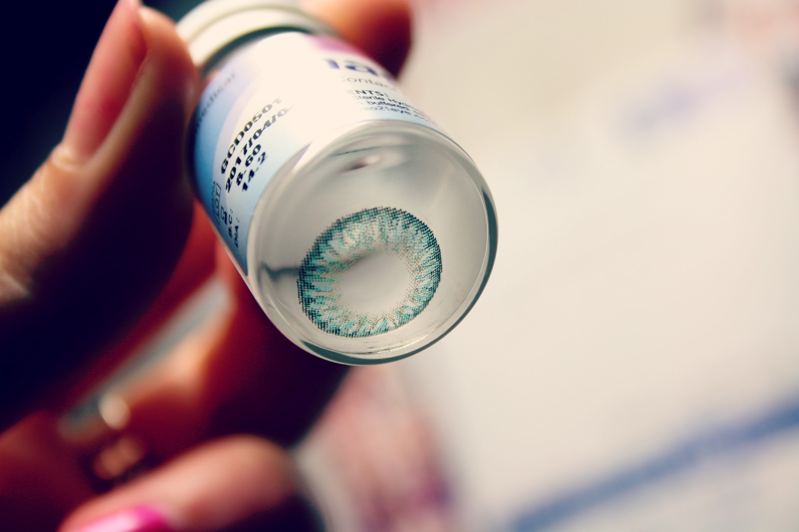 The lens arrived very well wrapped at my home and customer care was okay with the shop so I recommend to buy lenses from them! The lens itself looks like a vibrant turquoise with a golden ring in the middle (to blend better with dark eyes I assume). The outer ring is not as dark and artificial as most other lenses. Berry Holic lenses come in 7 different colors; Aqua, Blue, Green, Violet, Brown, Gray and Emerald. Aqua and Emerald are fusions of Blue + Green / Brown + Green which I really like! This is how the Berry Holic look in the vials:
