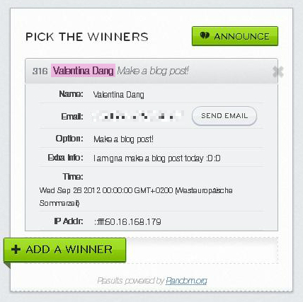 To keep it short, I drew a winner via rafflecopter/random.org after sorting all the entries, and the lucky winner is…………