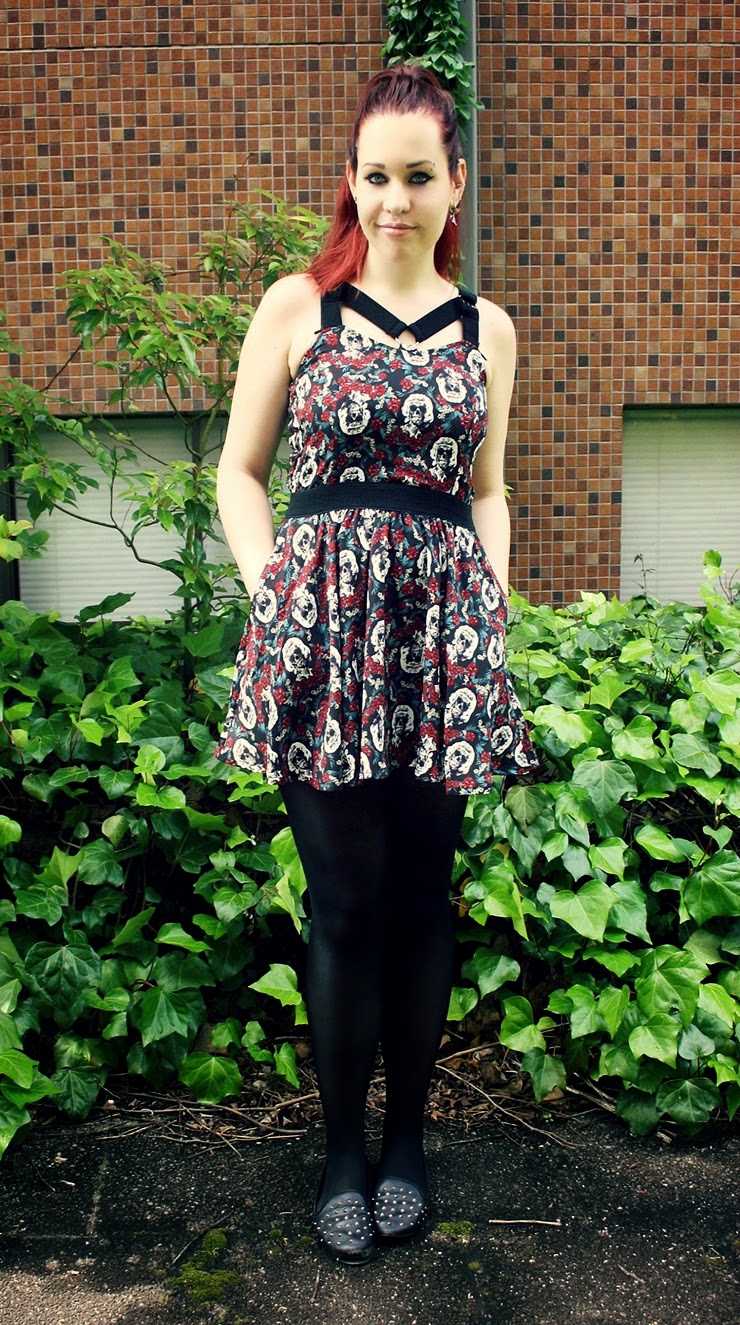 I found this amazing one-piece that I fell in love with at first sight. It has everything I love; it has a beautiful skull + flower pattern, It has lots of details and beautiful colors. It is a bit short, but then again, what isn’t in Japan when you’re 174cm tall. (I was actually surprised it fits me so well – it is onesize and they tend to be painfully tight, especially around the waist. However, this fits almost loose around the waist!) Oh, and as you can see it has pockets. Yay for dresses with pockets, I wish more dresses were designed like that. Here are more detailed shots: