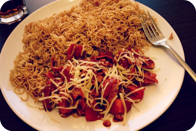 I call it “fried noodles inspired by taco rice” LOL. Just made some fried noodles with soy sauce and sesame oil, prepared a taco sauce and threw some garlic, ham (luckily my friends left me for breakfast) and tomatoes in and threw just some cheese over it. It may look like a disaster but it tasted quite good! :’D Usually my boyfriend gets food for Sunday since I’m always working but I forgot that I’m on my own now LOL. Learned my lesson, supermarket we’ll meet next Saturday! I could’ve invited myself for dinner at my mom’s place but nope, Sam is a survivor and can survive on her own! Pretty evident, isn’t it?