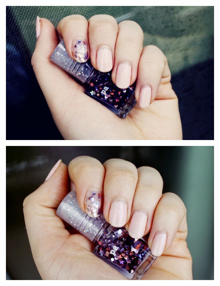 Went for a very minimalistic design last week with only one glittery fore finger. You can see a little bit of chipping where the glitter polish was and also a tiny bit on the middle finger. I was really impressed with how long my nails looked decent! I am very clumsy and active; so usually I have badly chipped polish around day two or three. With this topcoat however, my polish could last up to a week which I personally think is really impressive, also regaring the price of this product! Also, which is not as visible in this picture, the nails really are shiny and look a bit more, professional(?) than just regular polish. (BTW have you noticed how amazing that glitter nail polish is I am incredibly in love with it. It’s a lot more sparkly in real life.)