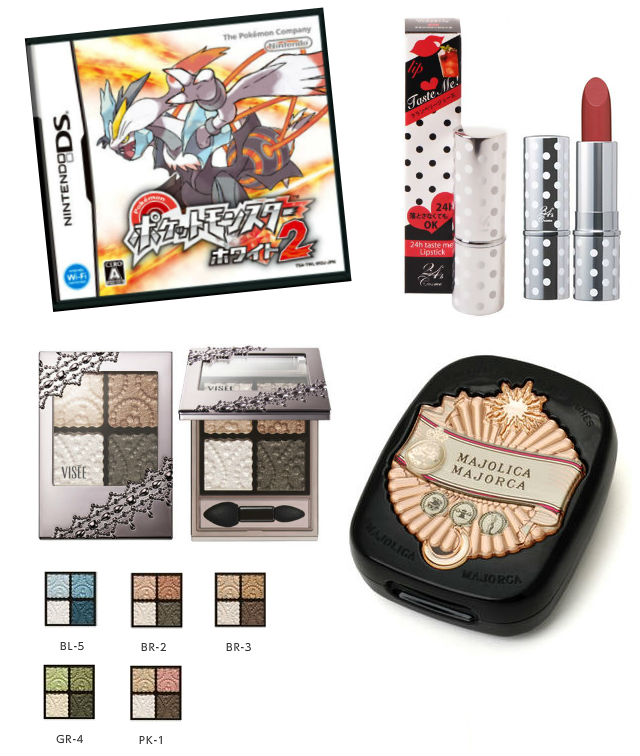 #1 Pokémon White 2, #2 Cosme 24 Lipstick in Cranberry Juice, # 3Visée Glam Glow Eyeshadow in PK-1 and the #4 Majolica Majorca Compact Powder.  What do you get when looking at this compilation? I’m a nerd but at least I might be a good-looking nerd LOL.