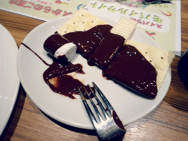 They had a chocolate fountain! Which I failed. I held my plate under without noticing and chocolate dripped everywhere.. T.T”